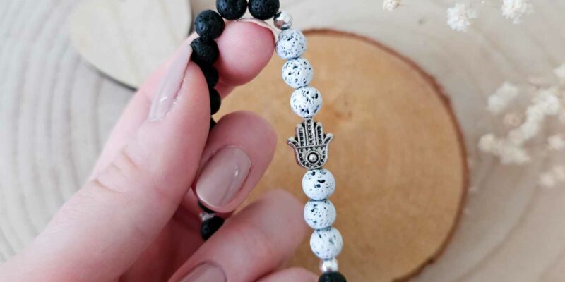 Náramek je vyrobený z 6 mm korálků černé a bílé lávy, doplněný symbolem hamsy.